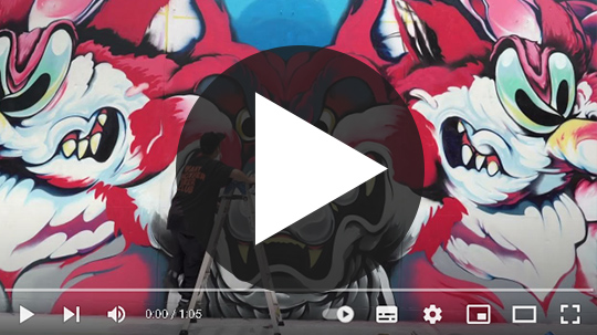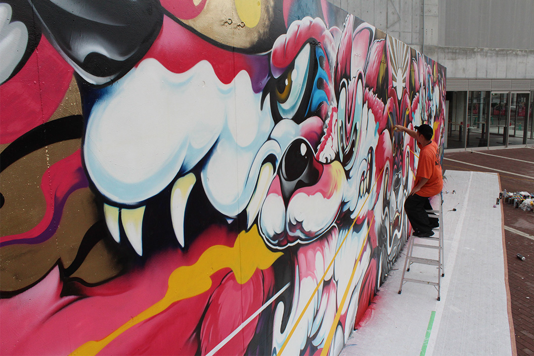 The work displays a symmetry on the huge wall at HANASAKA MURAL, and is cloaked in a sacred atmosphere. The mural lets us see KAC's “FULL POWER,” reminding us of the power of a good luck charm.