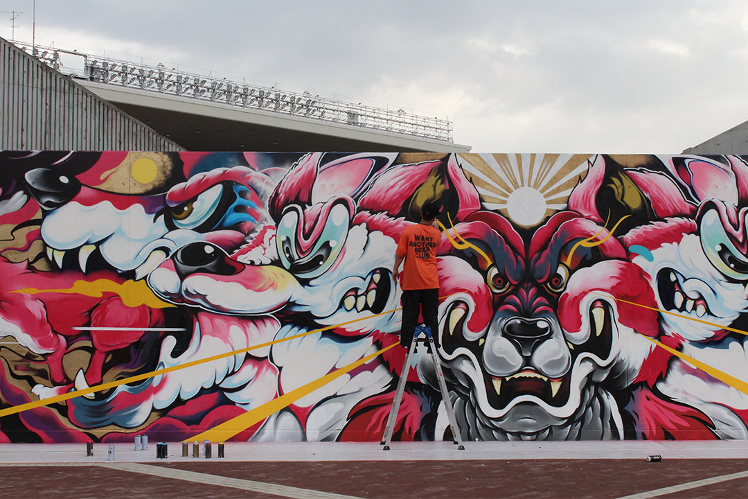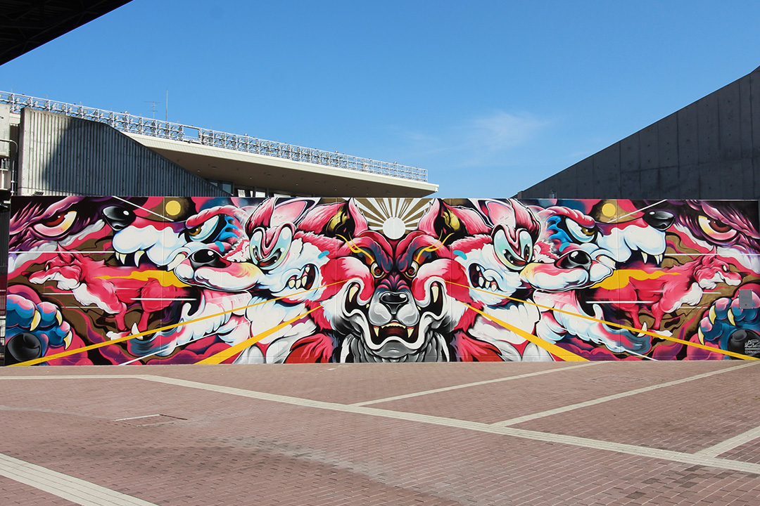 The wolf faith that is rooted in the region where the YODOKO SAKURA STADIUM stands today (seen in the Cerezo Osaka soccer team mascot), the changes that keep disturbing life in Japan and around the world, epidemics, disasters … we can say that they are all linked together. For the HANASAKA MURAL, I wanted to draw wolves that can defeat such evil.