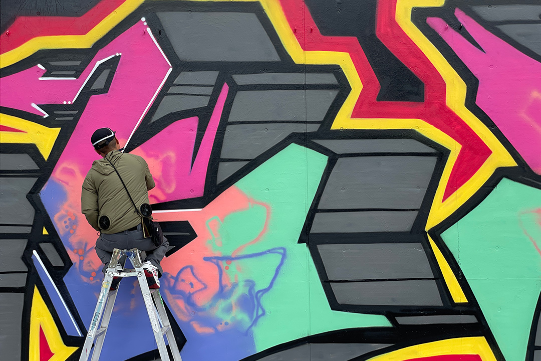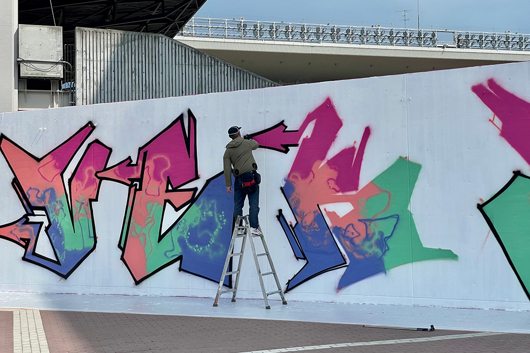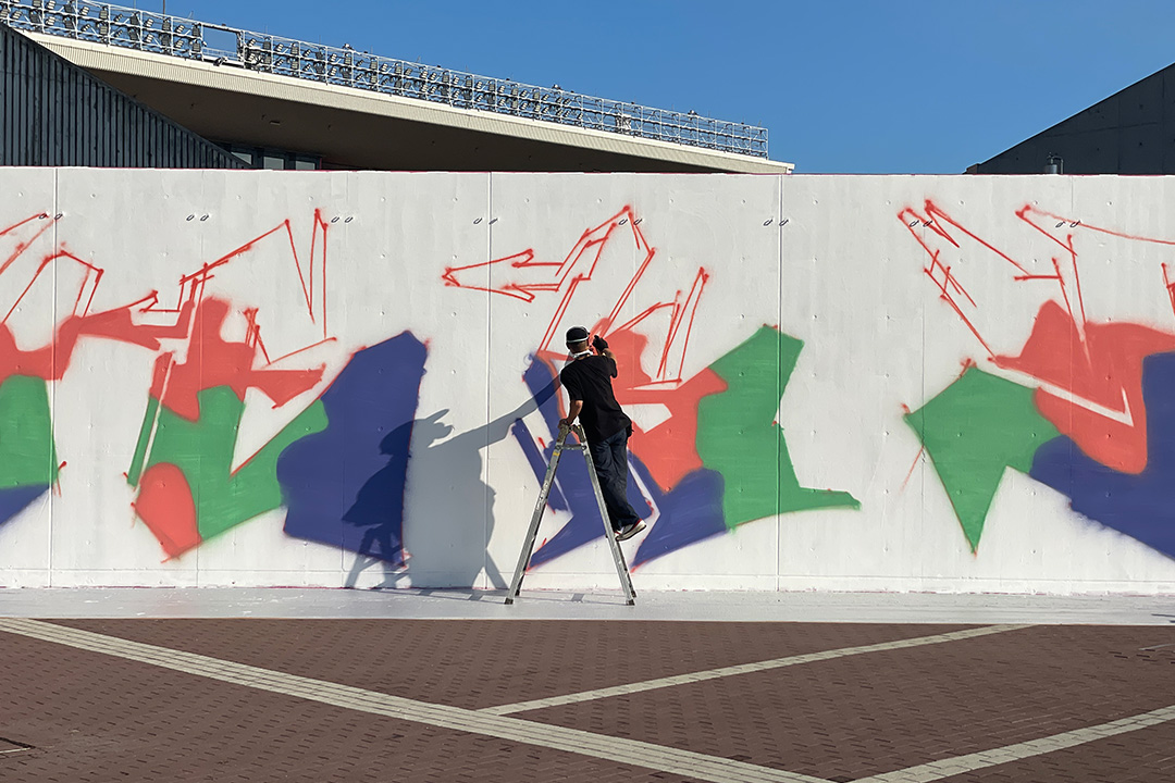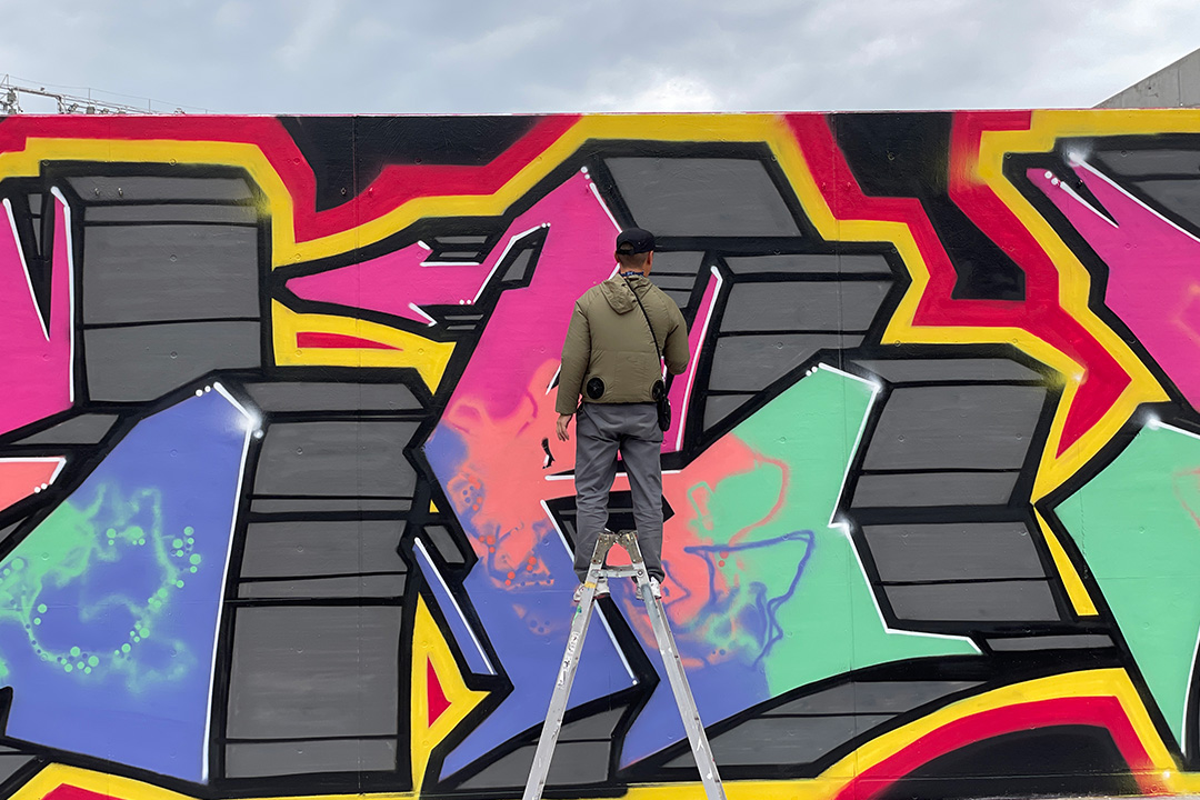 VERYONE has been active in Japan’s graffiti scene since its early days. The word ‘VERY,’ which he has been continuously painting for many years, embodies the fundamental act of graffiti: inscribing one’s existence into the streets. From this work, one can fully sense the intensity as if the traces of his movements while painting have been solidified on the wall, as well as the unique spirit and creativity of the street that he has cultivated throughout his journey.