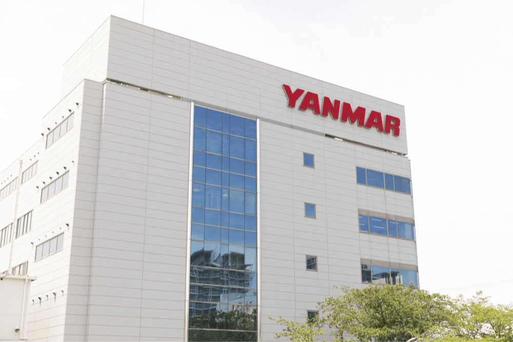 Under a clear sky, Takumi Minamino visited Yanmar Power Solutions Co., Ltd. in Amagasaki City, Hyogo Prefecture. The large windows on the white exterior walls shone in the sunlight, and the red “YANMAR” logo stood proudly on the front of the building.