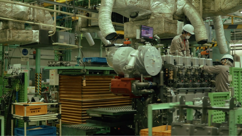 In this manufacturing site—where large marine engines are assembled one by one by hand—massive crankshafts, meticulous craftsmanship, and cutting-edge fuel cells designed with a zero-emission future in mind come together.