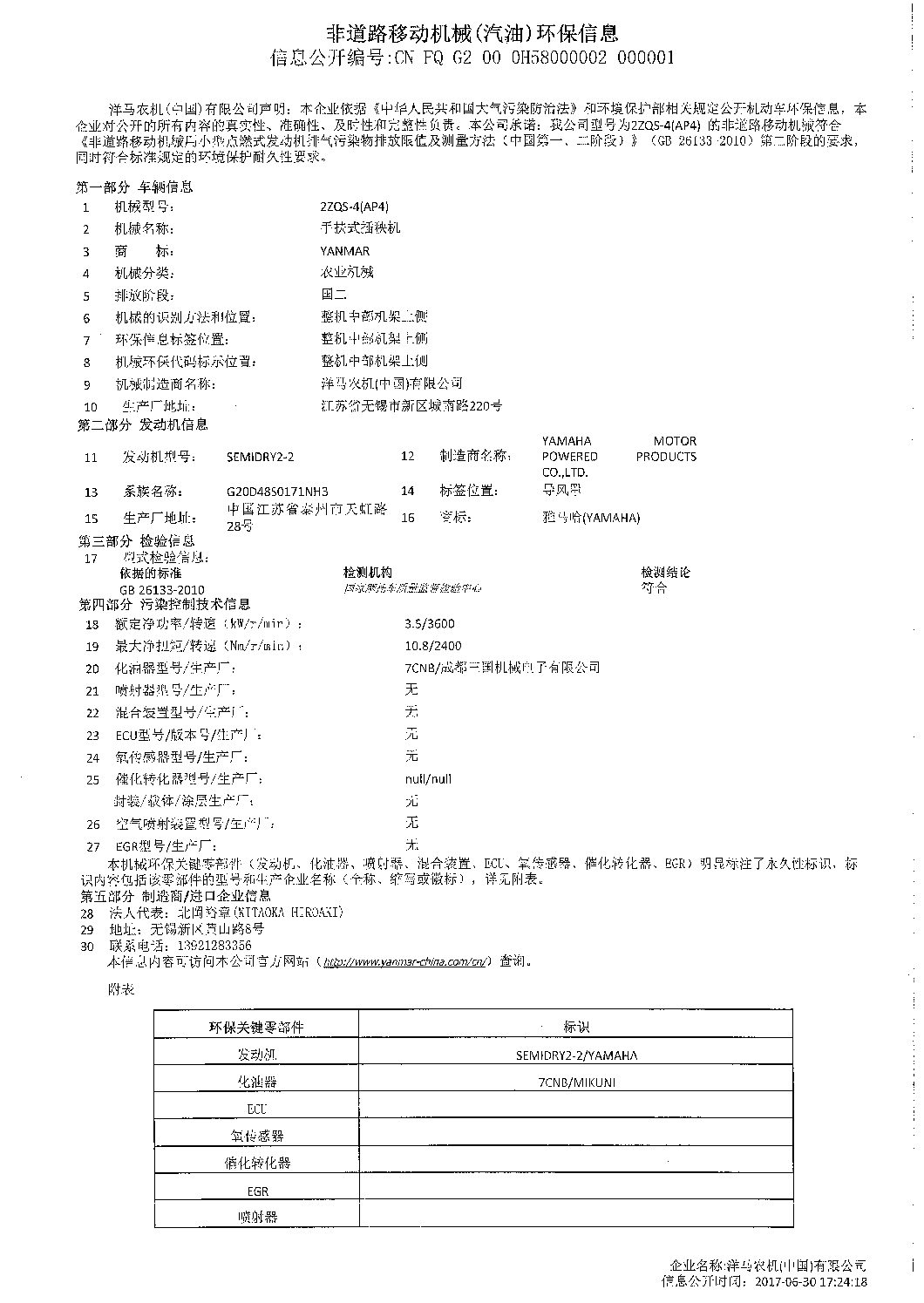洋马农机(中国)有限公司于2017年6月30日、VECC网站公布了AP4环保公开信息