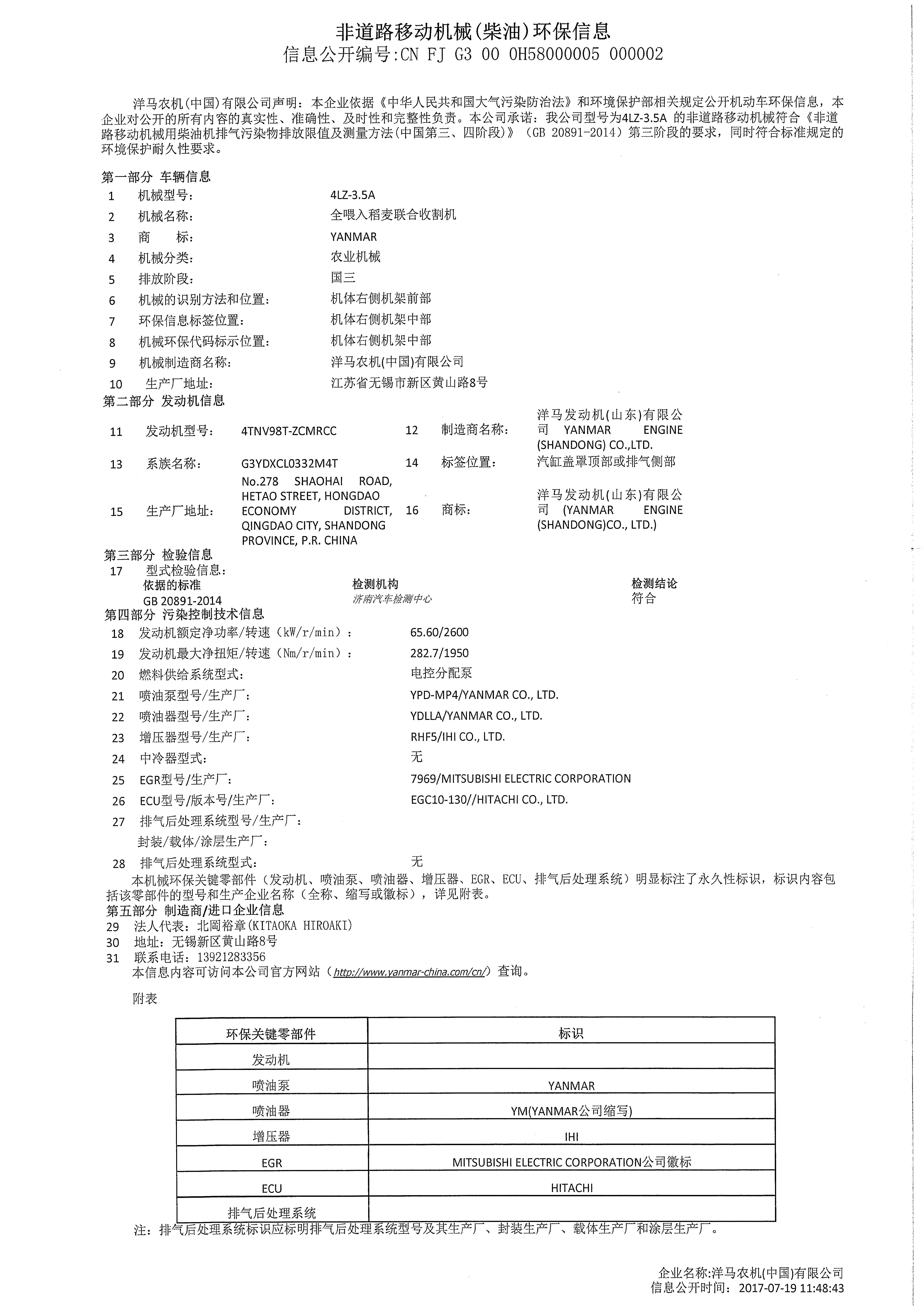 洋马农机(中国)有限公司于2017年7月19日在VECC网站公布了YH880(YSD) 环保信息,具体信息如下: