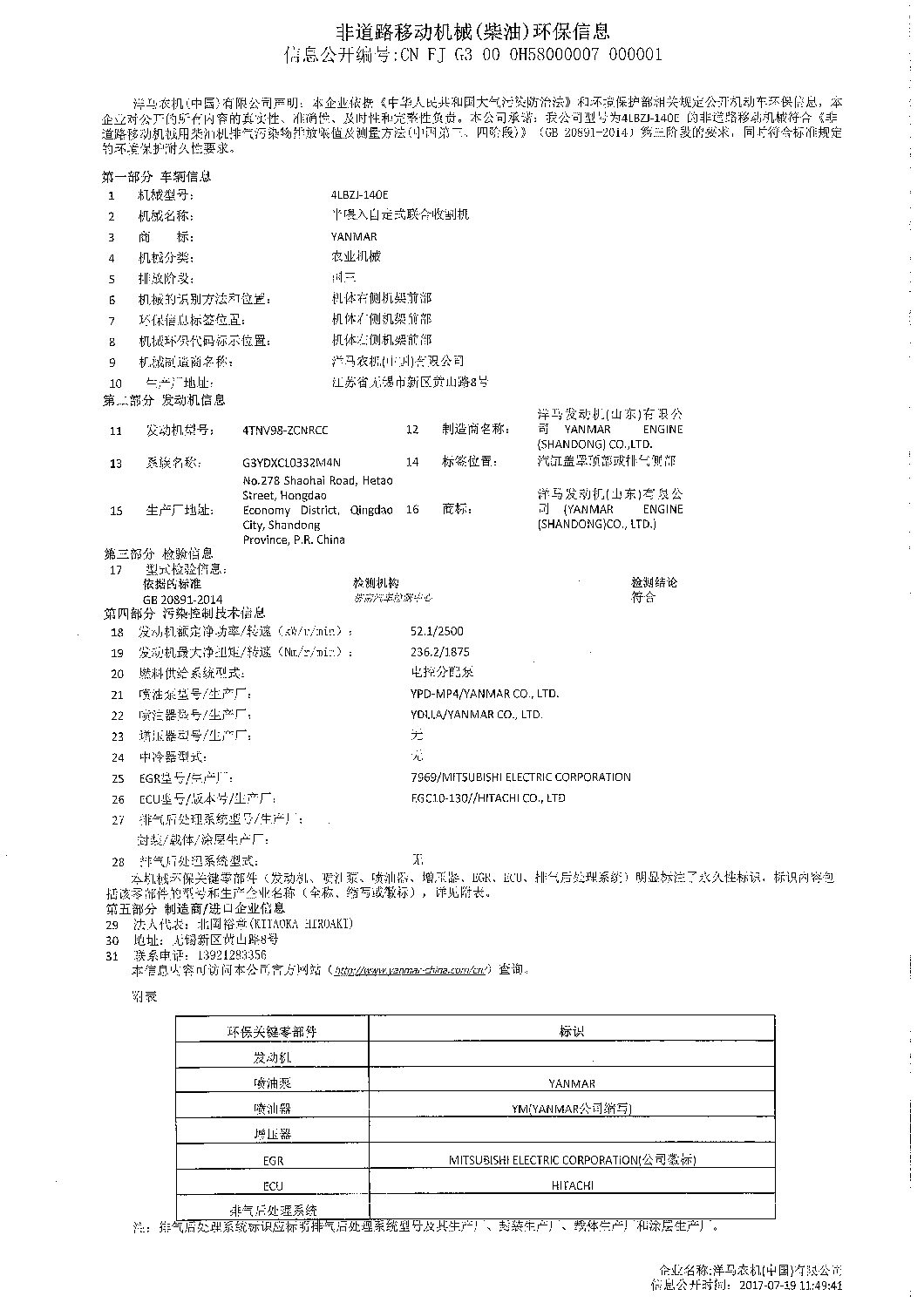 洋马农机(中国)有限公司于2017年7月19日在VECC网站公布了AG600GX环保信息,具体信息如下: