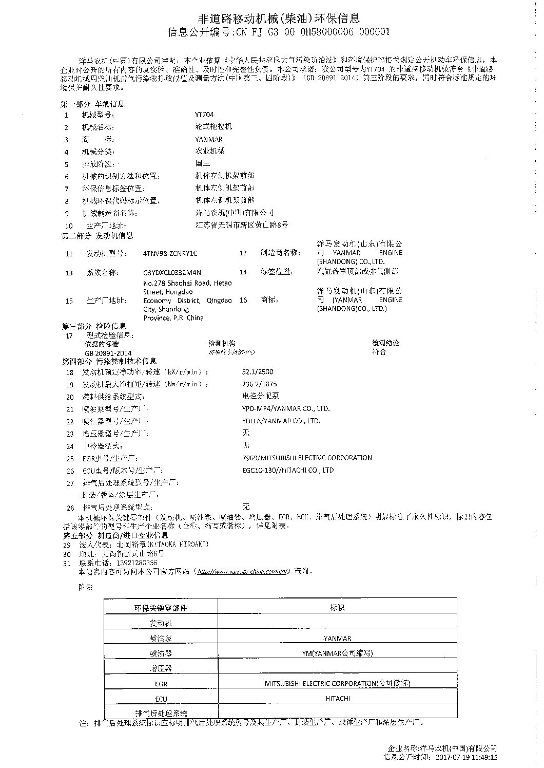 洋马农机(中国)有限公司于2017年7月19日在VECC网站公布了YT704环保信息,具体信息如下: