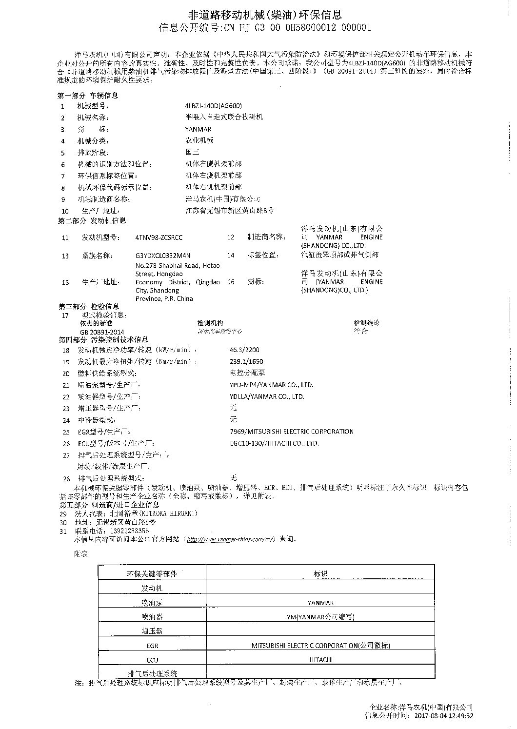 洋马农机(中国)有限公司于2017年8月4日在VECC网站公布了AG600环保信息,具体信息如下: