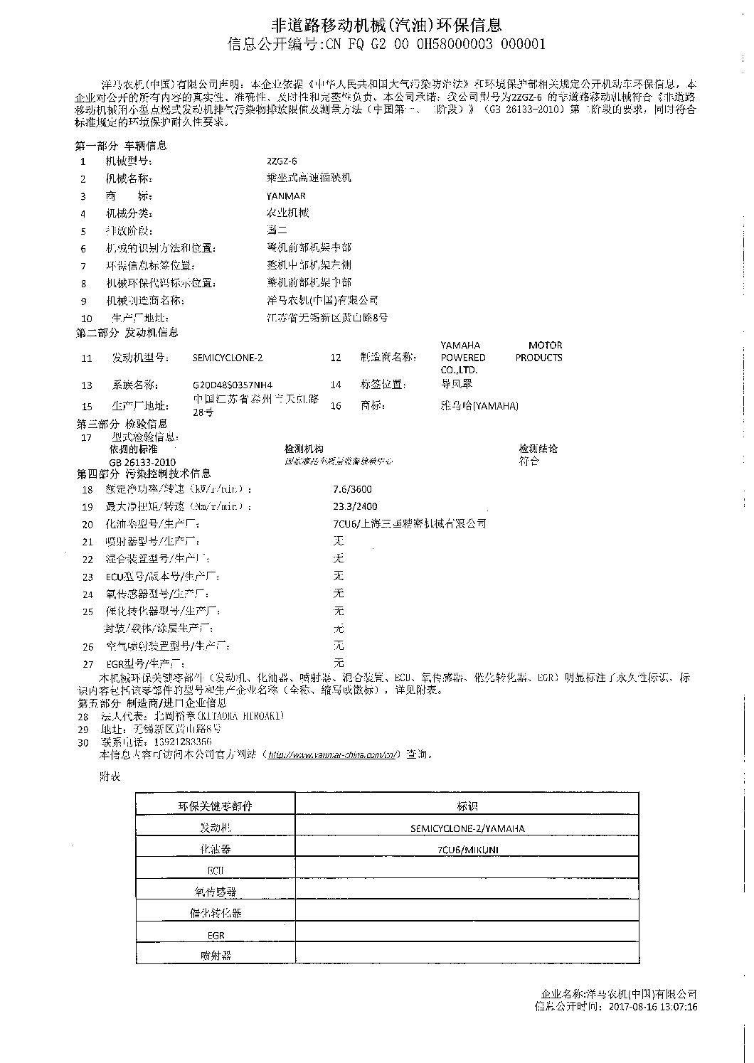 洋马农机(中国)有限公司于2017年8月16日在VECC网站公布了VP6E环保信息,具体信息如下:
