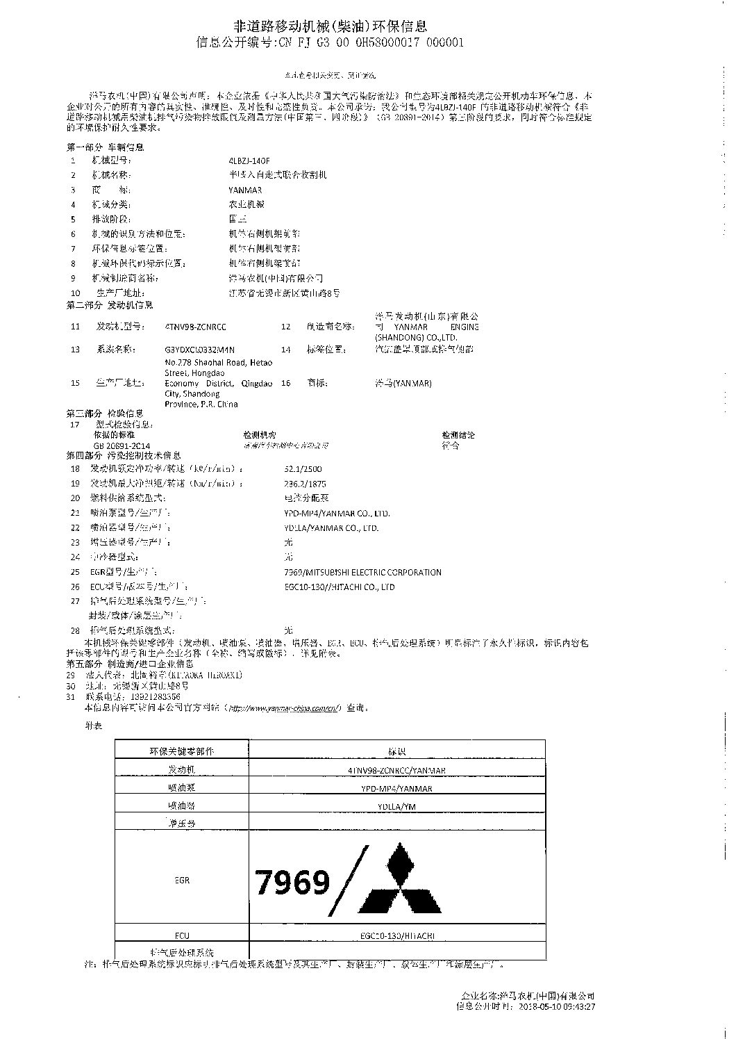 洋马农机(中国)有限公司于2018年5月10日在VECC网站公布了AG600A环保信息,具体信息如下: