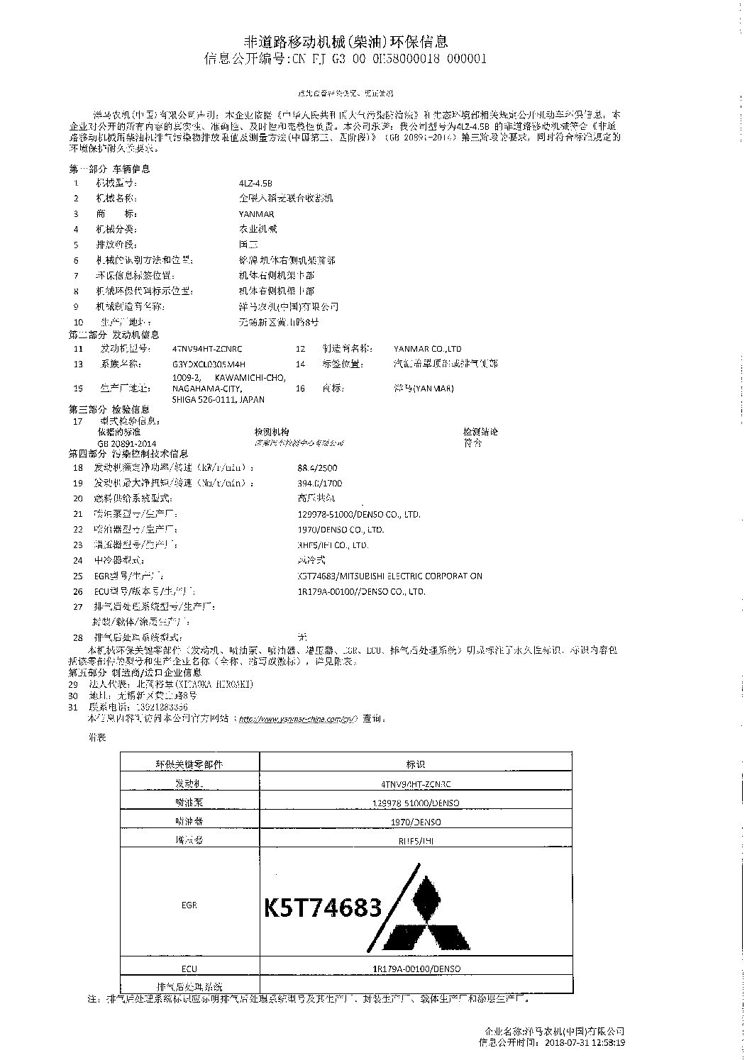 洋马农机(中国)有限公司于2018年7月31日在VECC网站公布了4LZ-4.5B环保信息,具体信息如下: