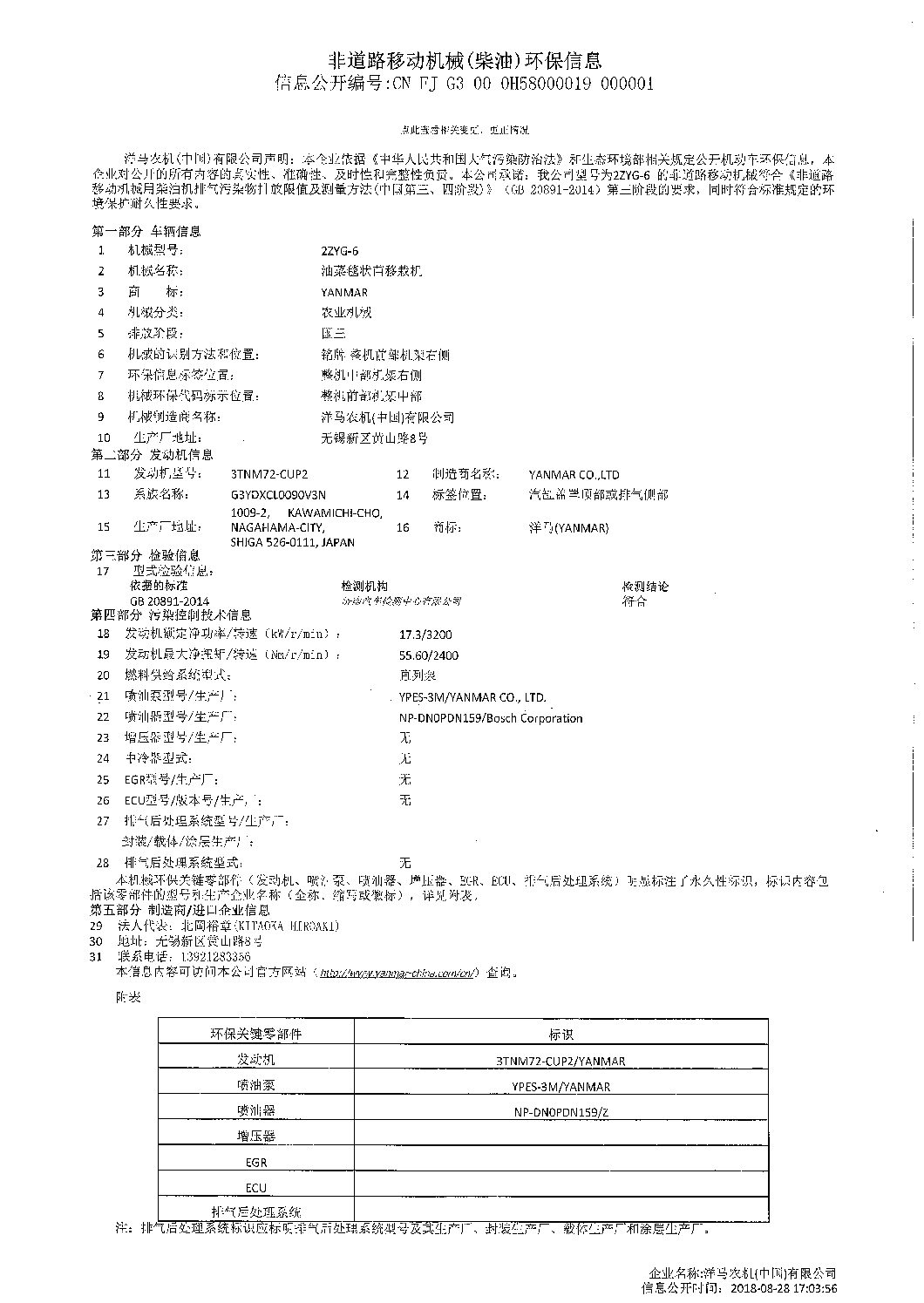 洋马农机(中国)有限公司于2018年8月28日在VECC网站公布了2ZYG-6环保信息,具体信息如下: