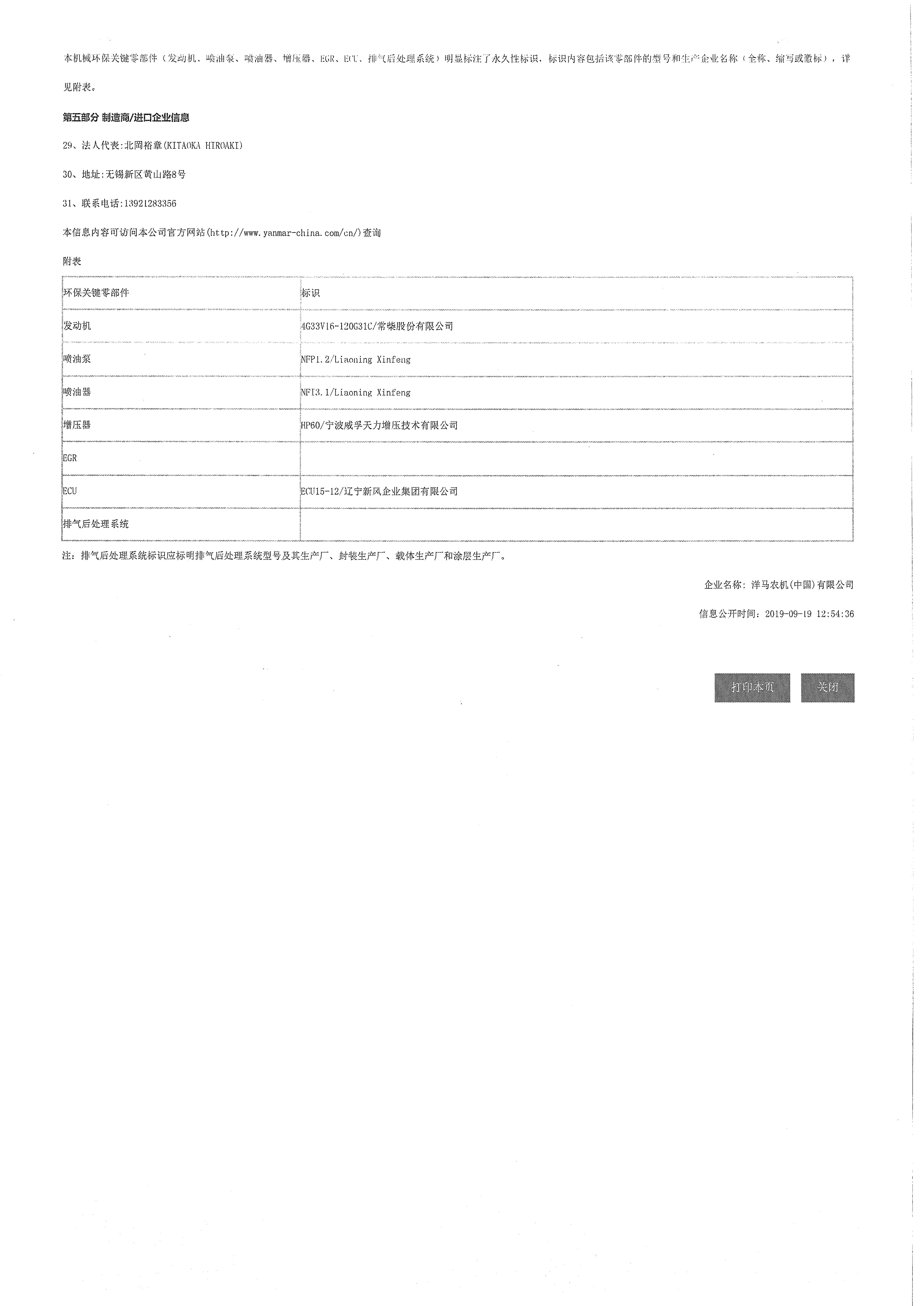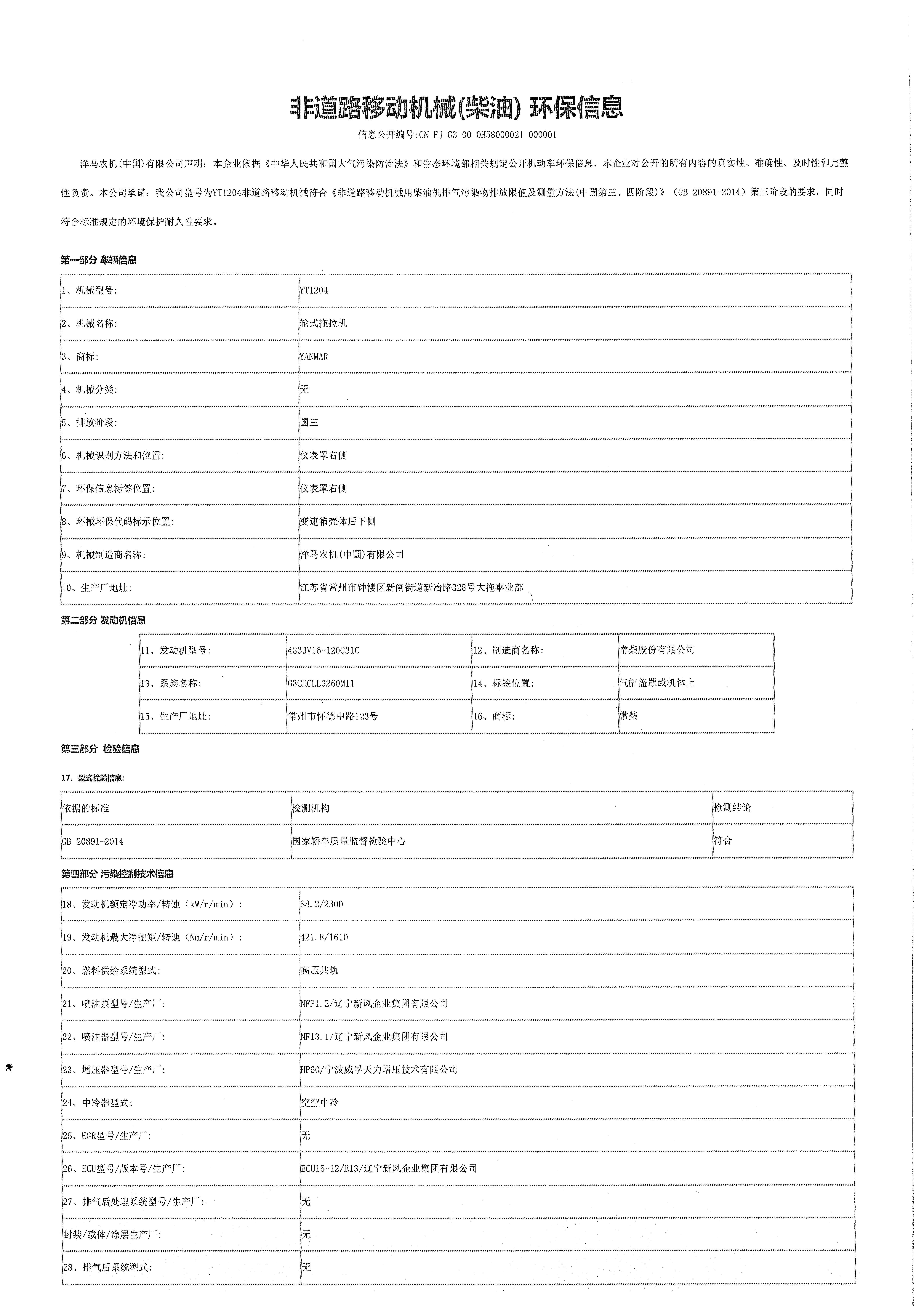 洋马农机(中国)有限公司于2019年9月19日在VECC网站公布了YT1204环保信息,具体信息如下:
