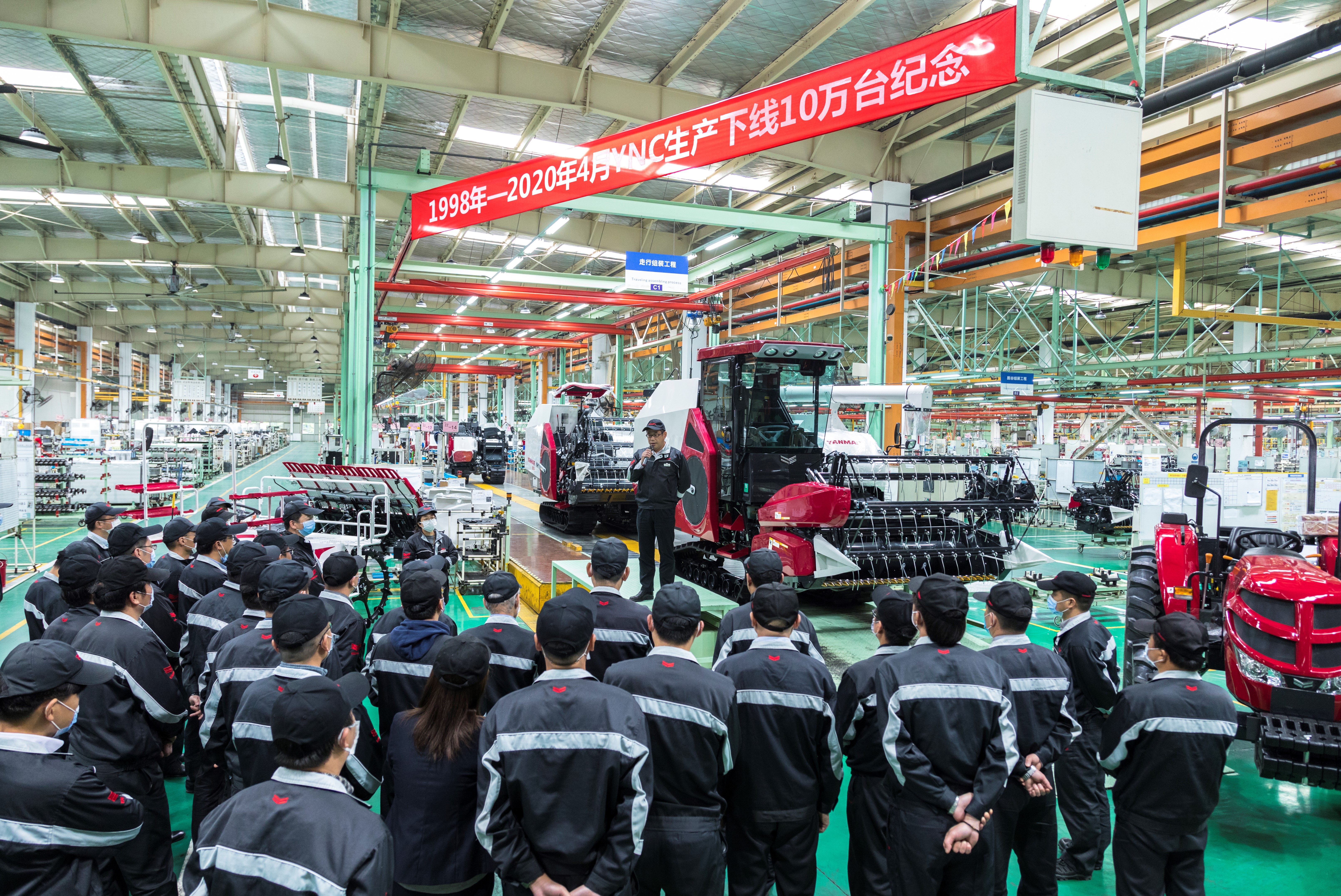 2020年4月11日,洋马农机(中国)有限公司 以下简称“YNC”迎来了累计生产10万台这一历史性时刻。当天下午3点,公司总经理上田启介、各位副总经理、各位部门长,以及生产统括部相关人员聚集在全喂入收割机生产下线处,共同见证了第10万台洋马产品(全喂入收割机YH1180)的下线,参加了纪念仪式。