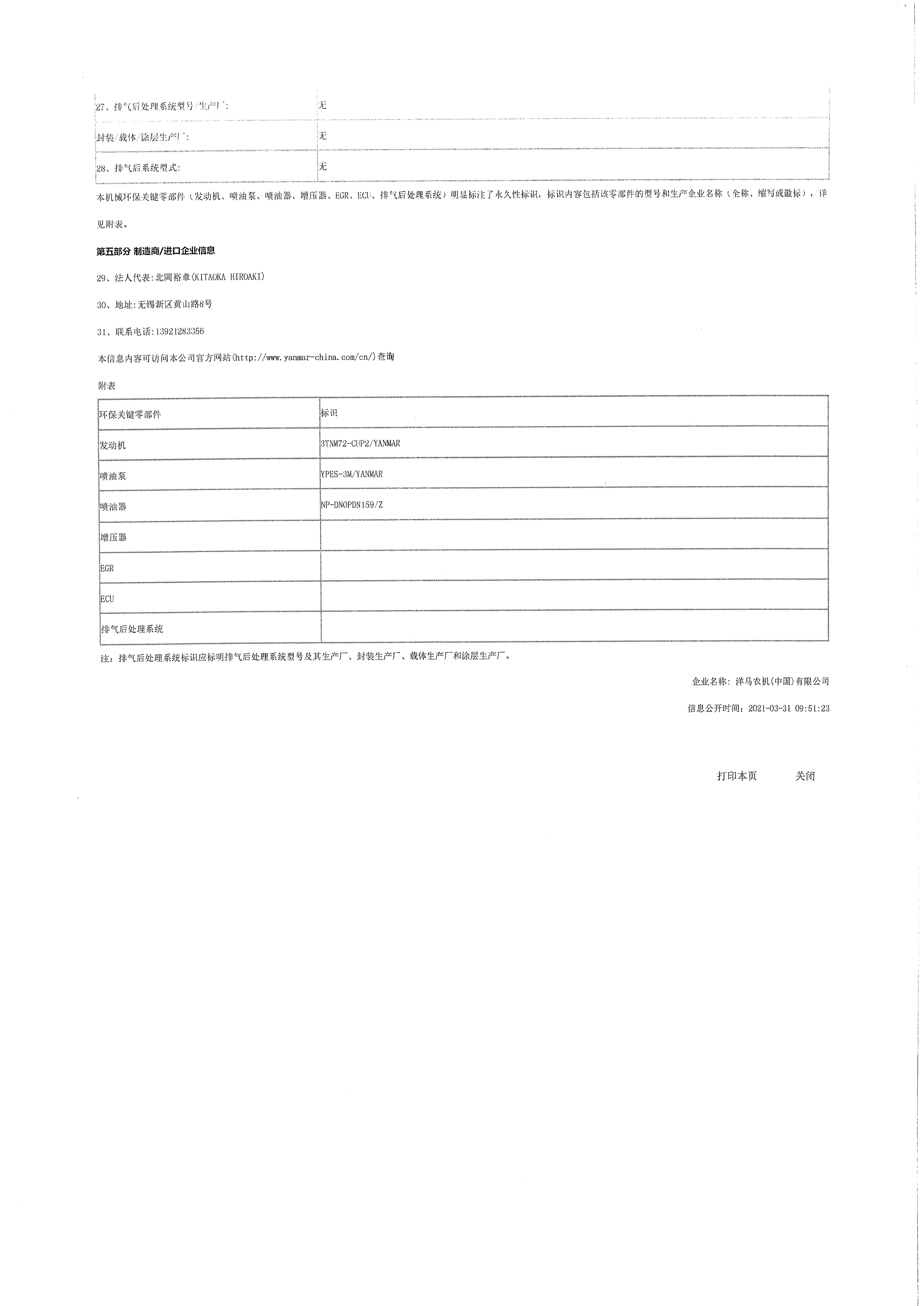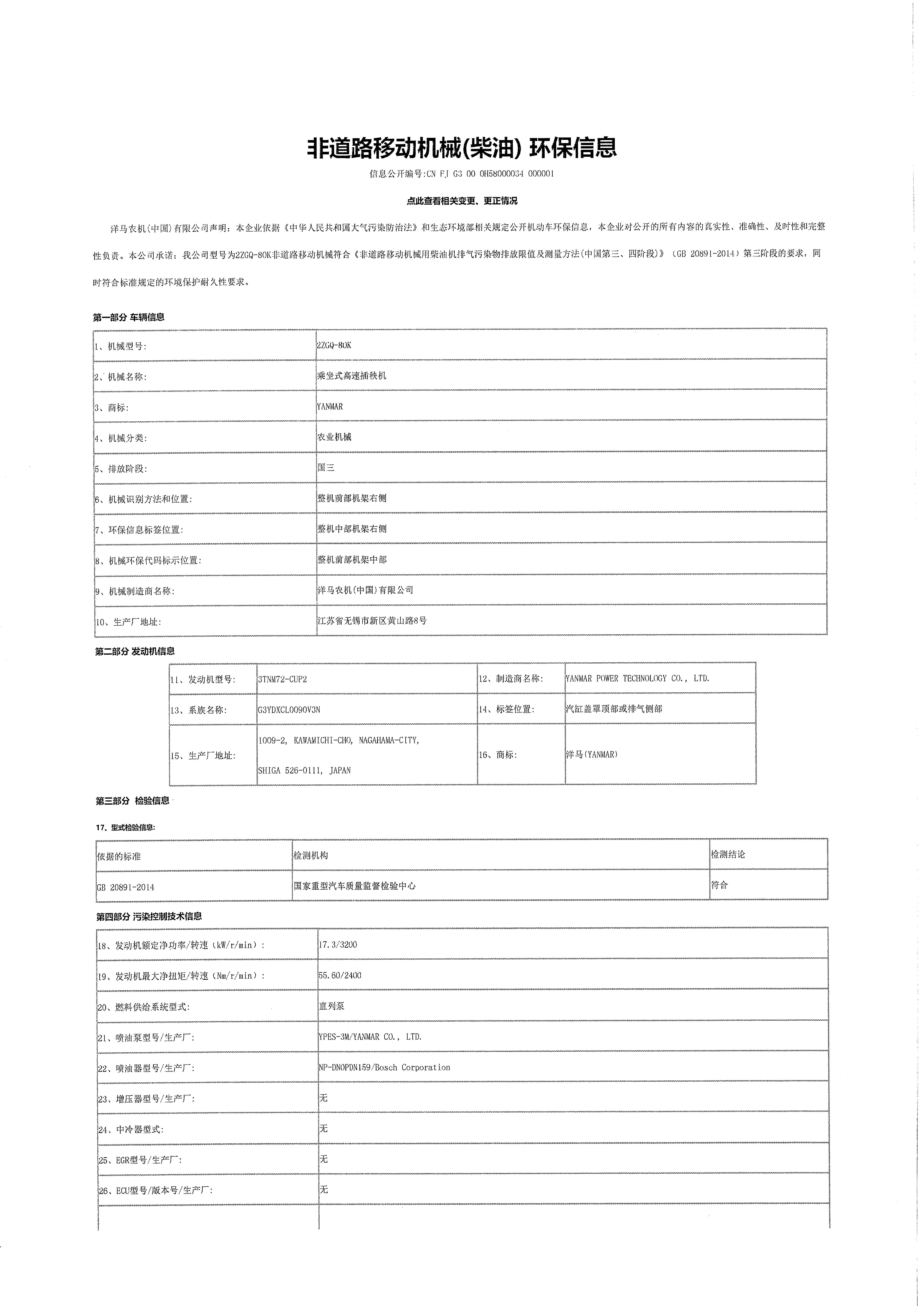 洋马农机(中国)有限公司于2021年3月31日在VECC网站公布了2ZGQ-80K环保信息,具体信息如下: