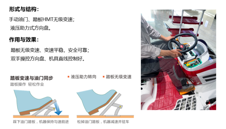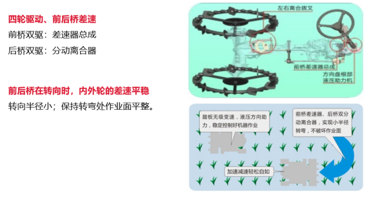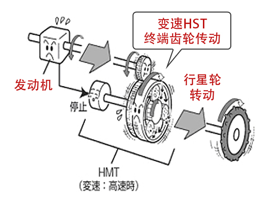 配置高效HMT行走变速箱(液压变速+齿轮传动),其比传统HST变速箱传动效率高出15%