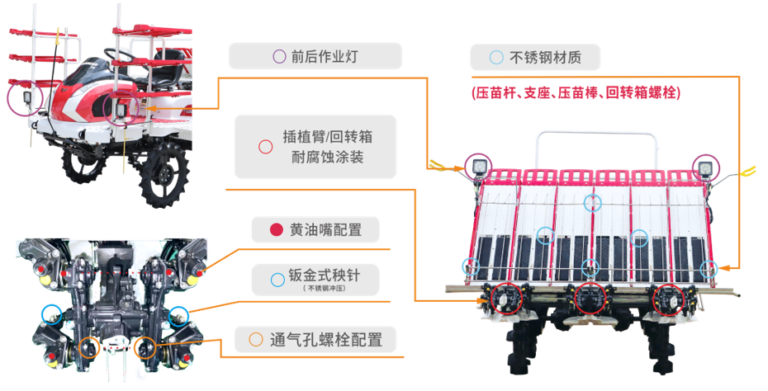 插植臂、回转箱耐腐蚀涂装,不锈钢材质压苗杆不易生锈,更耐久。