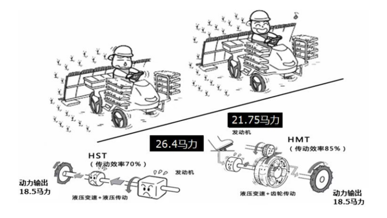 比传统的单体液压无级变速HST相比噪音低,传动效率提高15%。