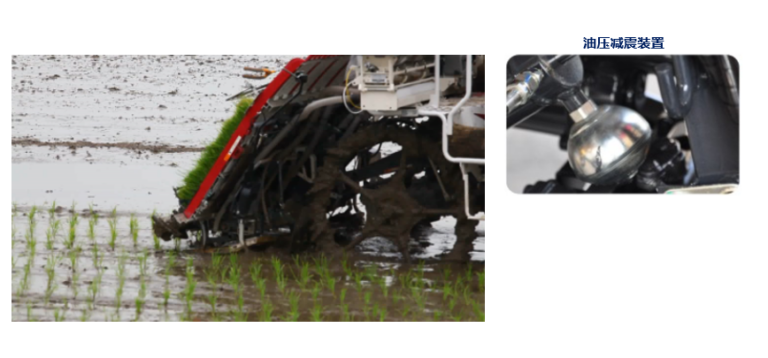 载秧台油压减震装置可以减少载秧台落地时对作业面的冲击,保持作业面平整;同时减缓高速作业中浮船在不平整泥面上的颠簸。