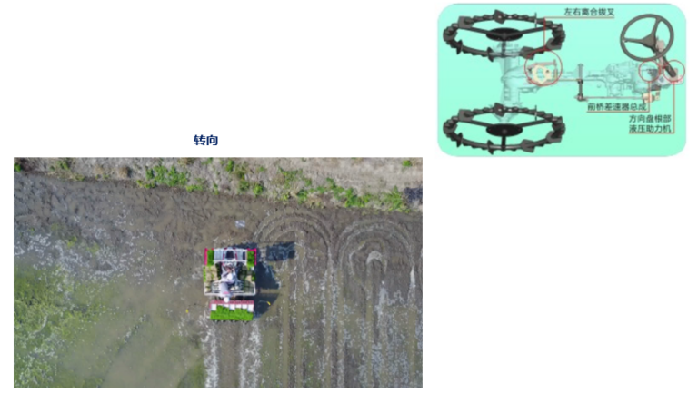 前轮独立减震,吸收由田块高低不平引起的秧台上下震动,以及由于泥脚深浅引起的颠簸,稳定插秧深度。