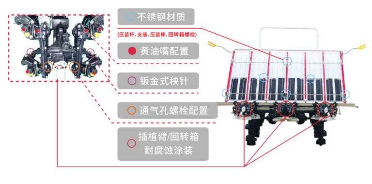 插植臂、回转箱总成涂装,耐腐蚀,不锈钢材质压苗杆不易生锈,更耐久。
