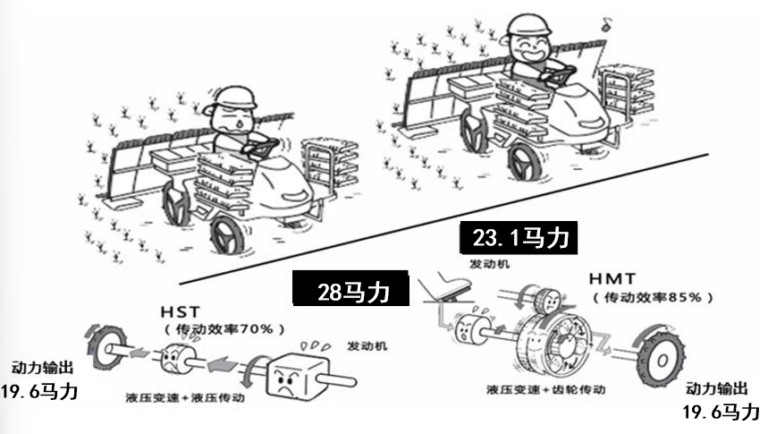 与传统的单体液压无级变速HST相比噪音低,传动效率高出15%,达到85%。