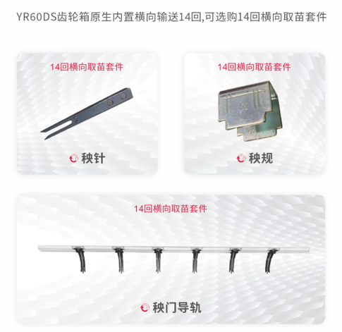 中央传动箱体内已配置14回横向取苗齿轮,可以选购14回导轨、秧针、秧规等配件后使用。