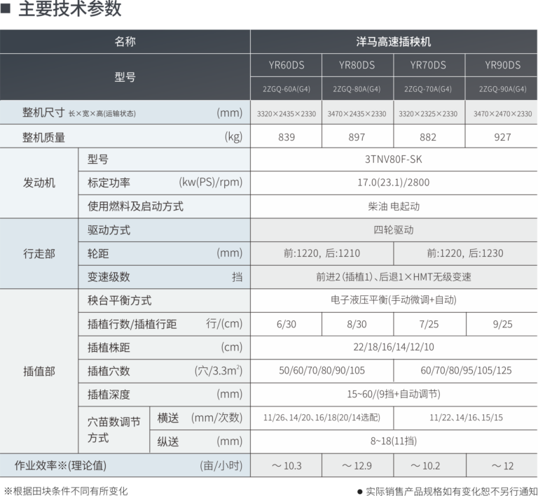 ⒉理论作业效率: YR60DS:0 ∽ 10.3亩/小时, YR80DS:0 ∽ 12.9亩/小时