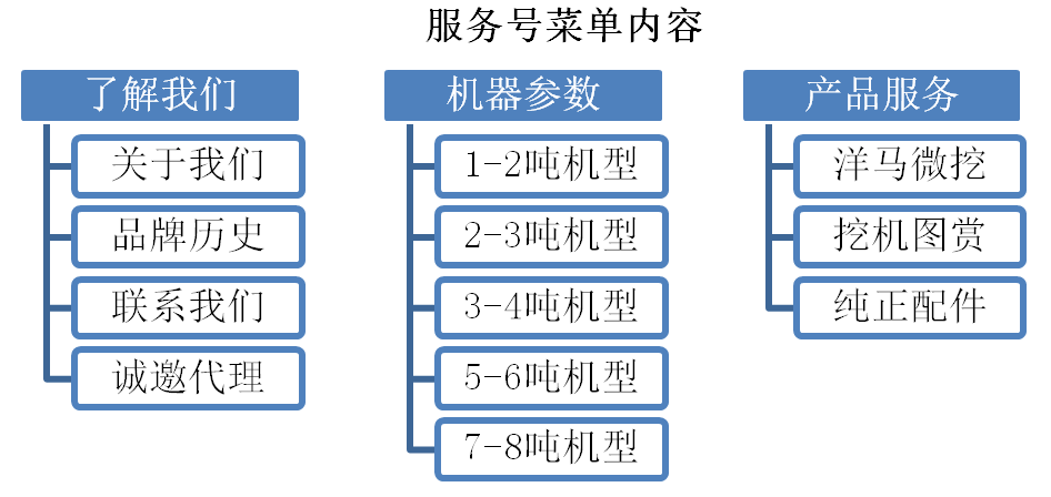 作为洋马建机产品的推广平台,建机部于2015年3月份成功申请了名为 “洋马建机”的微信服务号。目前服务号内容大致分为公司信息介绍、产品参数介绍和产品相关信息介绍三个方面。虽说是“洋马建机”的服务号,但作为洋马上海的一部分,服务号还包含了洋马上海的公司信息以及洋马品牌的介绍。在推广建机产品时,除了挖掘机的基本参数以外,服务号中还增加了产品卖点的说明和纯正配件的信息,以方便关注服务号的人更直接、更全面地了解洋马的产品。而且接下来“洋马建机”还会不断添加更多丰富的产品信息,从而更好地帮助关注者了解洋马。
