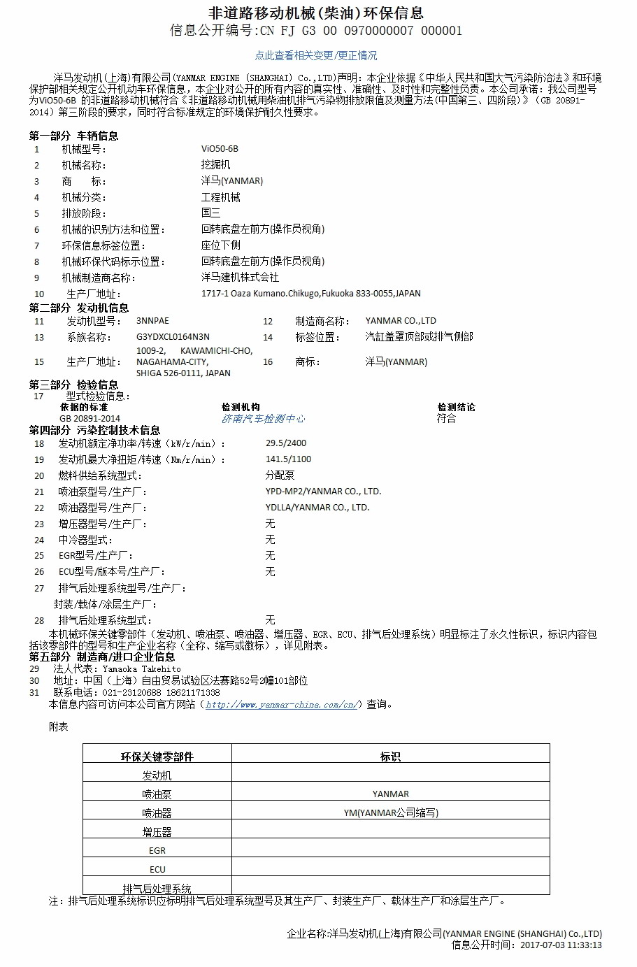 洋马发动机( 上海)有限公司于2017年7月3日在机动车环保网上公布了ViO50-6B的环保信息,具体信息如下: