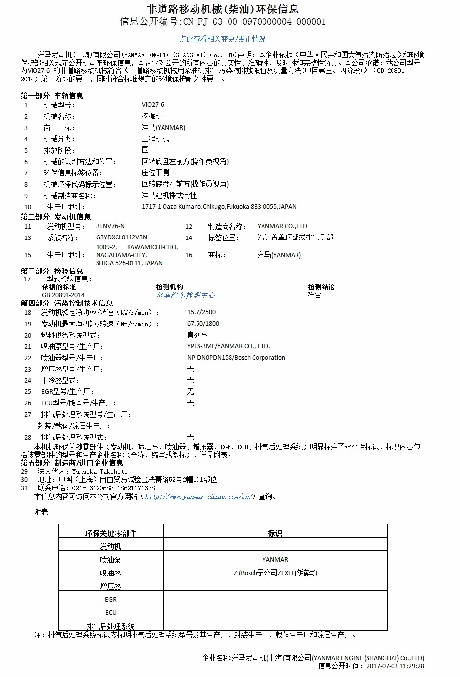 洋马发动机( 上海)有限公司于2017年7月3日在机动车环保网上公布了ViO27-6的环保信息,具体信息如下: