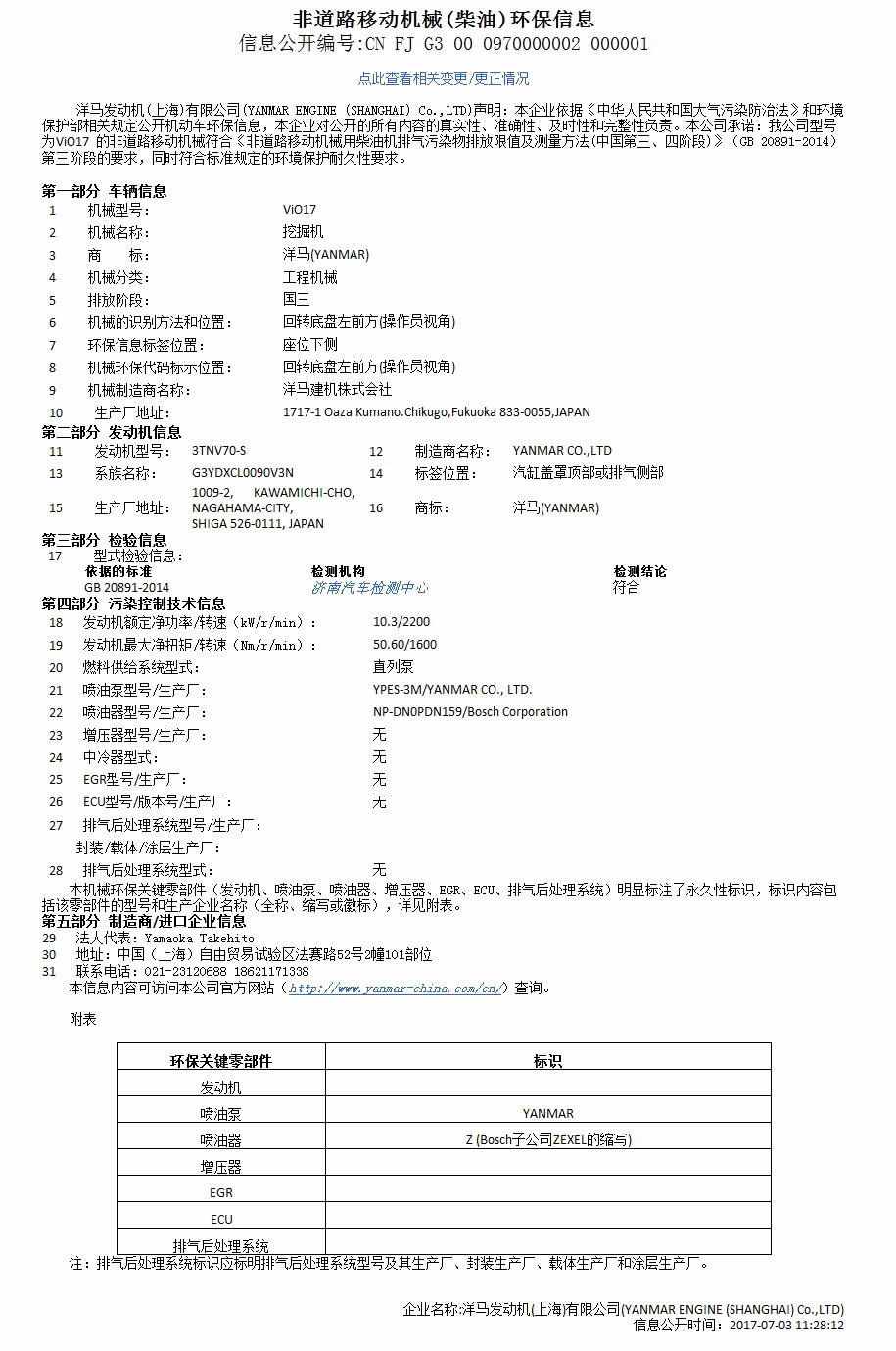 洋马发动机( 上海)有限公司于2017年7月3日在机动车环保网上公布了ViO17的环保信息,具体信息如下: