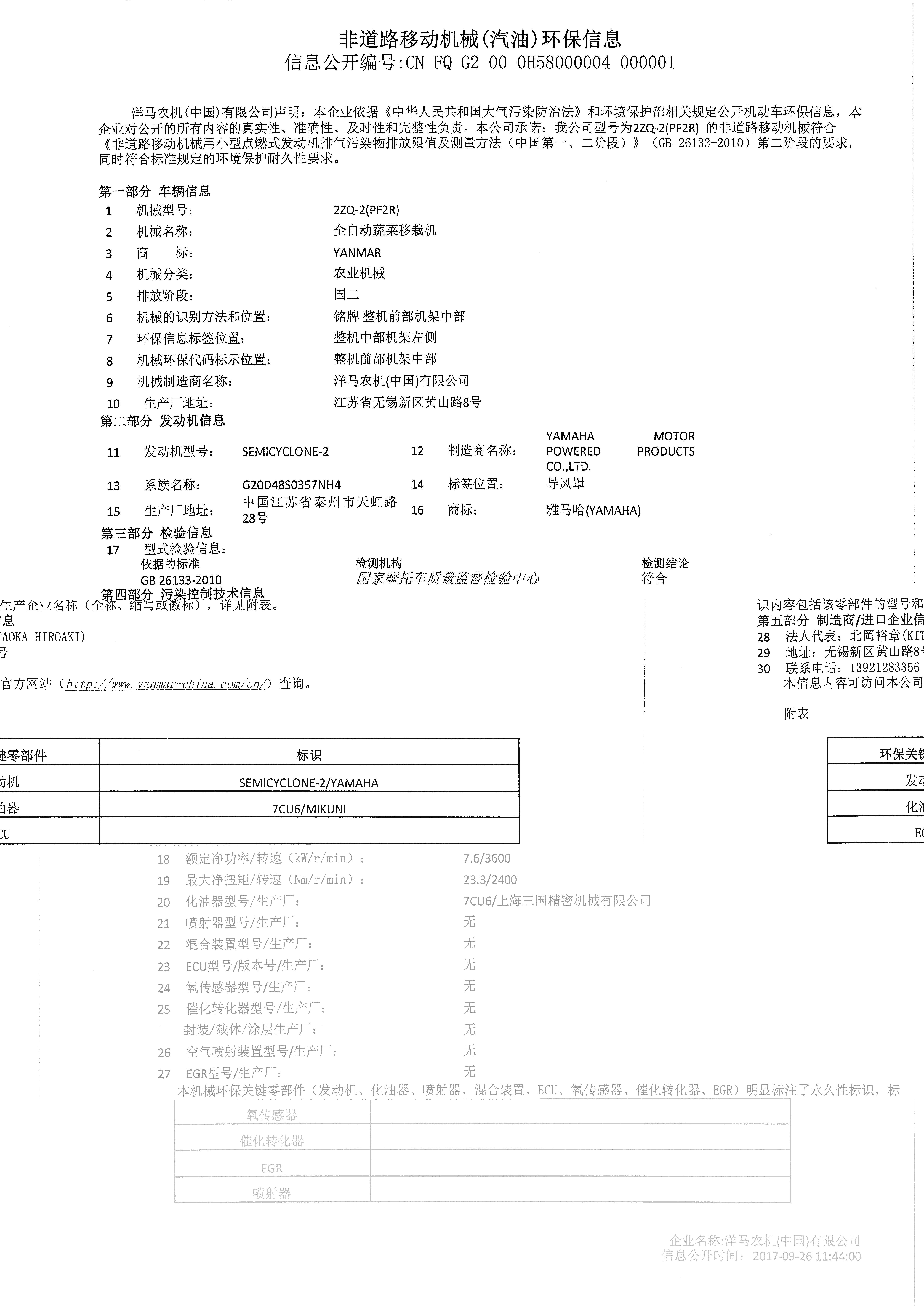洋马农机(中国)有限公司于2017年9月26日在VECC网站公布了PF2R环保信息,具体信息如下: