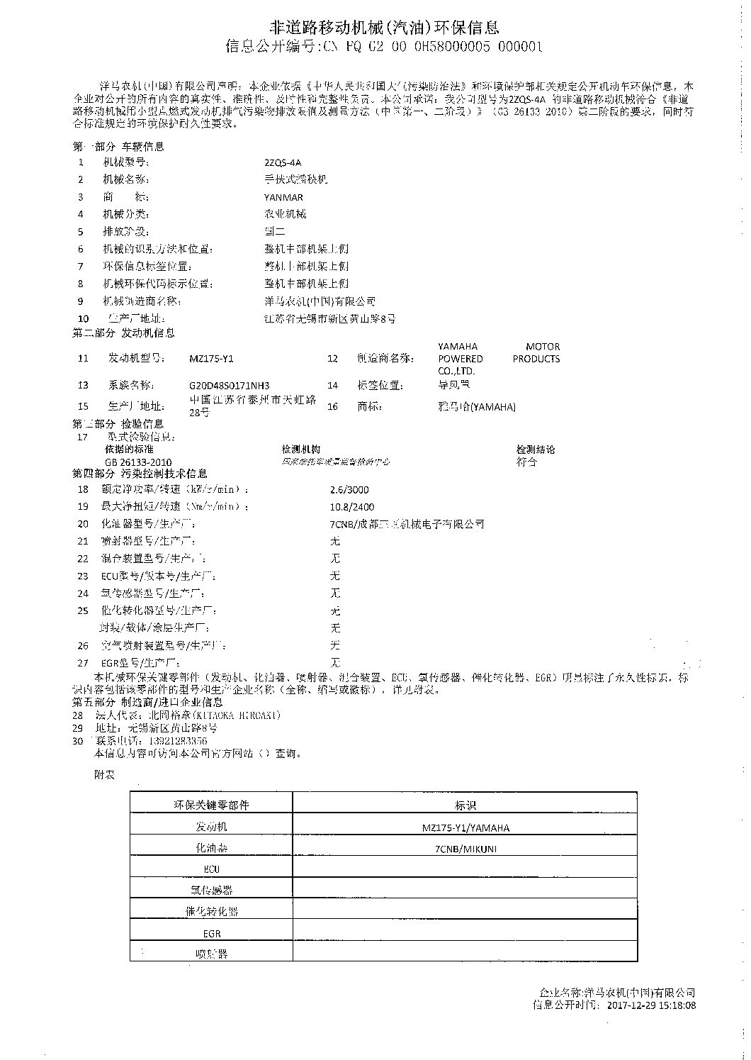 洋马农机(中国)有限公司于2017年12月29日在VECC网站公布了2ZQS-4A环保信息,具体信息如下: