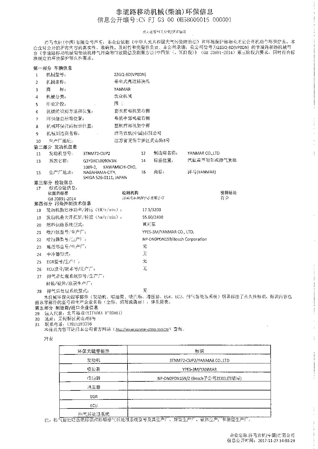 洋马农机(中国)有限公司于2017年11月27日在VECC网站公布了VP8DN环保信息,具体信息如下: