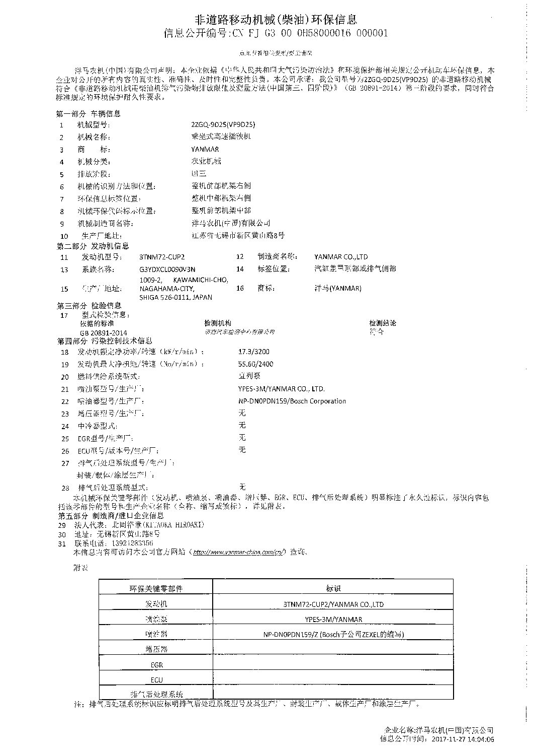 洋马农机(中国)有限公司于2017年11月27日在VECC网站公布了VP9D环保信息,具体信息如下: