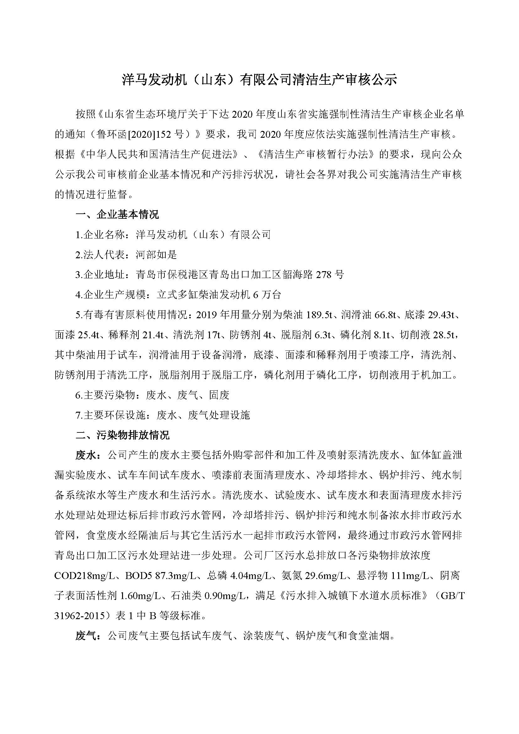 洋马发动机(山东)有限公司清洁生产审核公示